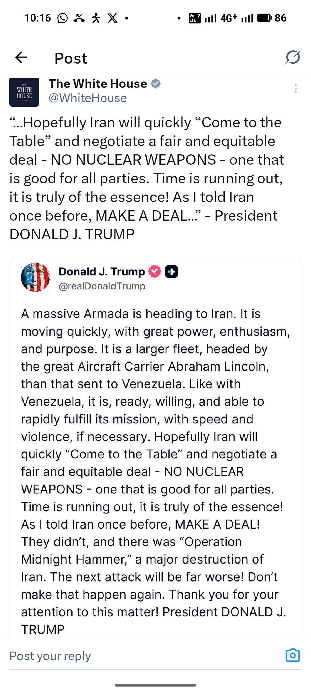 इससे पहले डोनाल्ड ट्रंप ने दावा किया था कि अमेरिका ने ईरान की ओर एक विशाल सैन्य बेड़ा भेजा है, जिसकी अगुवाई एयरक्राफ्ट कैरियर कर रहा है। ट्रंप ने ईरान से “डील कर लो वरना हालात और खराब होंगे” जैसी भाषा का इस्तेमाल किया।